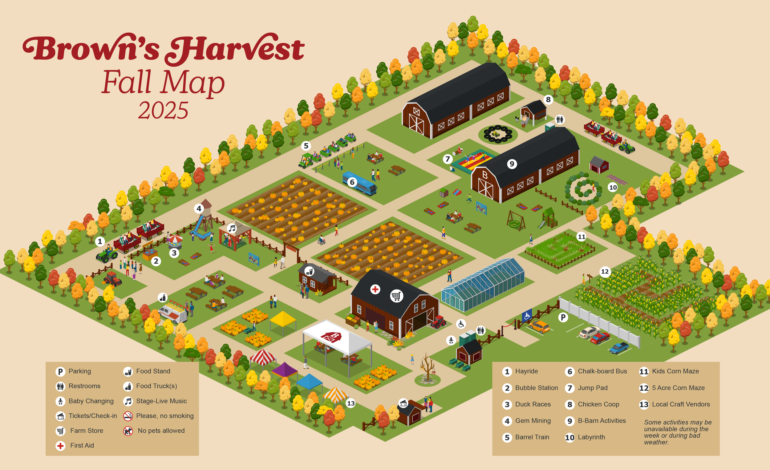 This map was created to reflect the layout of the farm as accurately as possible. It’s meant to give you a general idea of where everything is located and help guide you to all the fun experiences we have to offer!